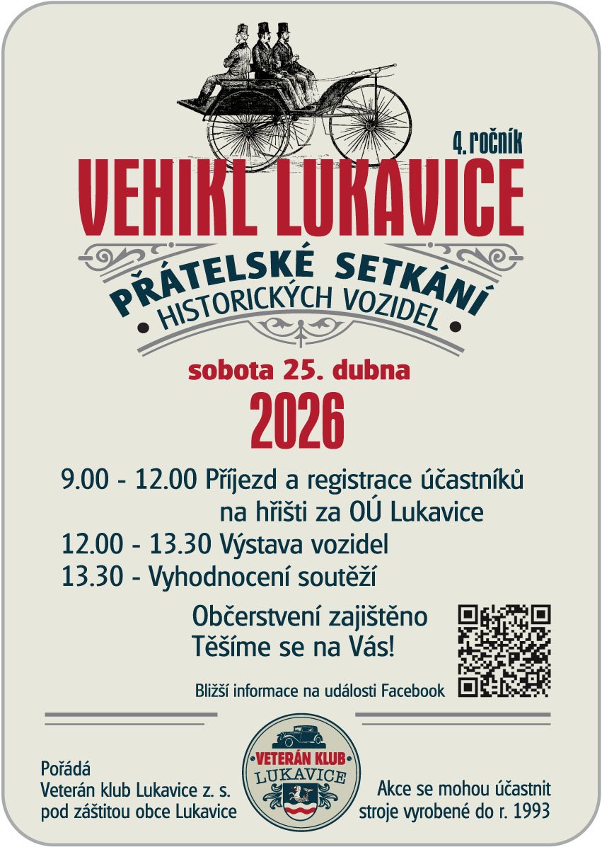 Uz v sobotu 25. dubna 2026 se uskutecni 4. rocnik pratelskeho setkani historickych vozidel – VEHIKL LUKAVICE. Vydejte se podivat na krasne veterany, nasat atmosferu minulych let a uzit si pohodove sobotni dopoledne Program: 9:00-12:00 prijezd a registrace ucastniku 12:00-13:30 vystava vozidel 13:30 vyhodnoceni soutezi Misto: hriste za obecnim uradem Lukavice Obcerstveni zajisteno Ucast mozna pro vozidla vyrobena do roku 1993 Prijdte podporit skvelou akci nasich sousedu!