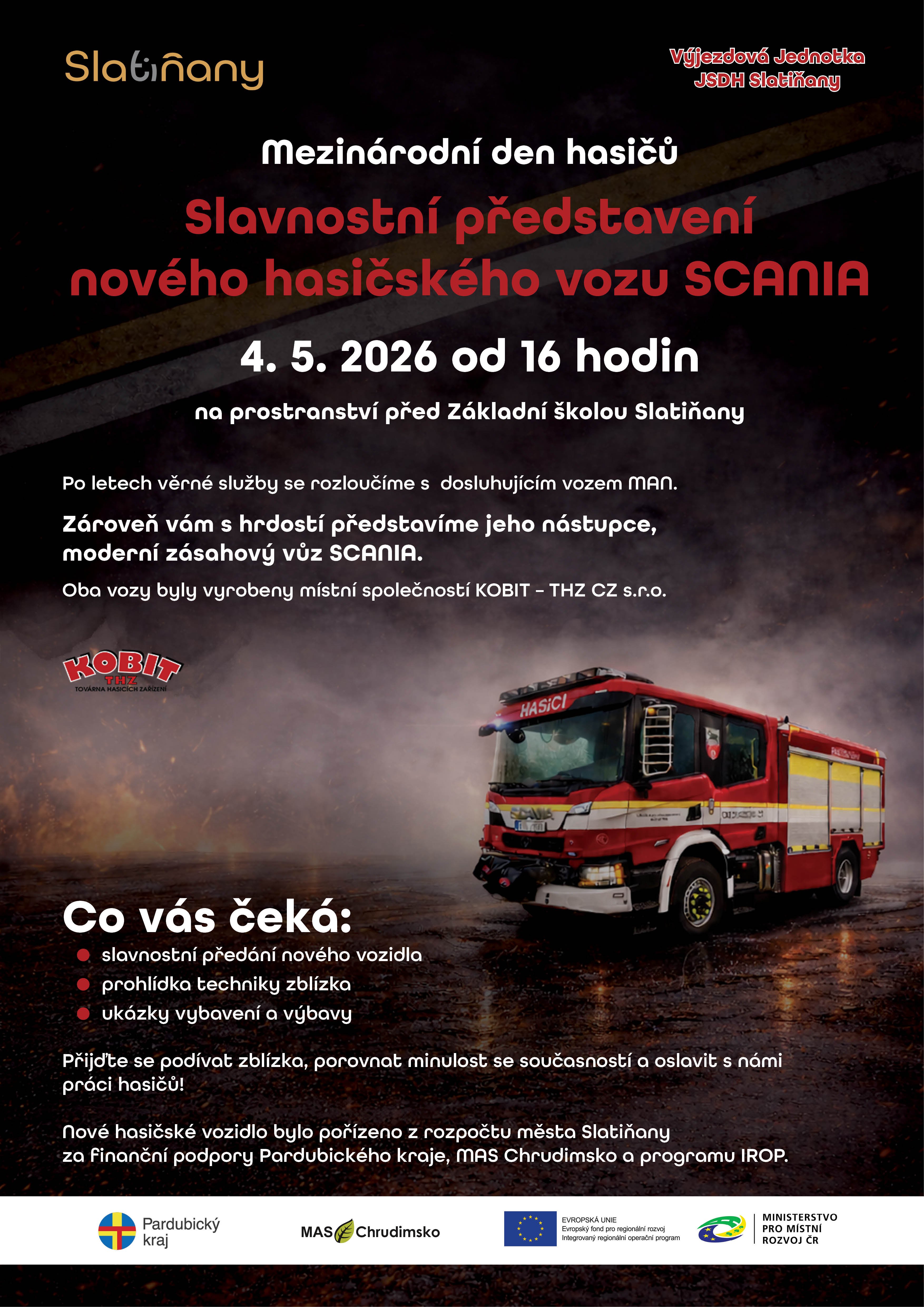 Srdecne Vas zveme na oslavu Mezinarodniho dne hasicu, pri ktere spolecne privitame novy zasahovy vuz SCANIA a zaroven se rozloucime s dlouholetym vozem MAN. 4. 5. 2026 od 16:00 prostranstvi pred Zakladni skolou Slatinany (T. G. Masaryka 136) Na co se muzete tesit? slavnostni predani noveho vozidla prohlidka techniky zblizka ukazky vybaveni hasicu Prijdte se podivat, porovnat techniku minulosti a soucasnosti a podporit praci nasich hasicu. Tesime se na vas!