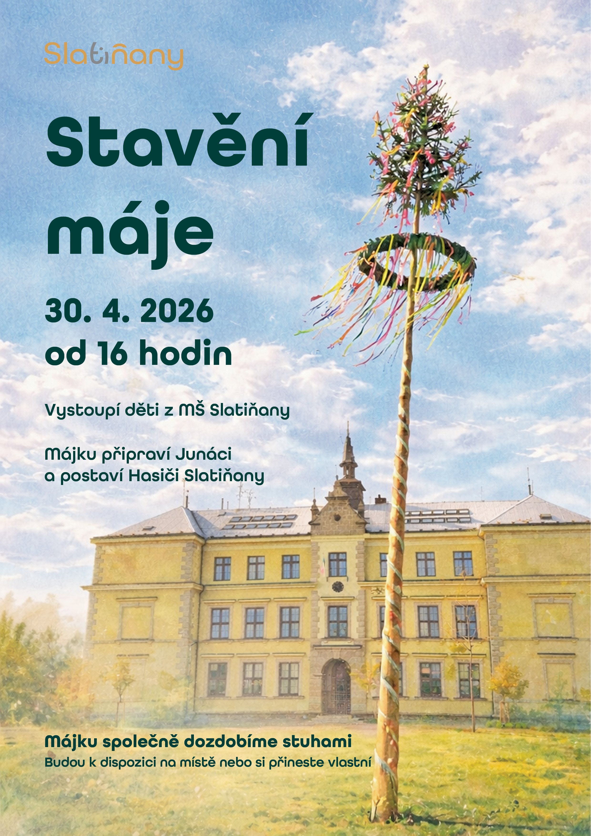 30. 4. 2026 od 16:00 hodin pred budovou ZS (T. G. Masaryka 136) Ceka vas odpoledne plne tradic a dobre nalady: vystoupi deti z MS Slatinany Junaci pripravi majku hasici ji spolecne postavi A nakonec ji spolecne ozdobime barevnymi stuhami (stuhy budou na miste, nebo si prineste vlastni)